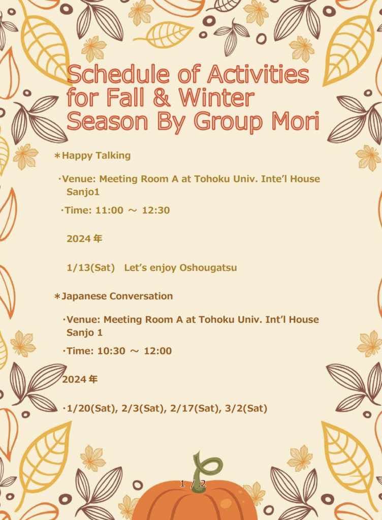 皆さん、お元気でしょうか。冬が来て雪が降り、寒い冬がやってきますが、健康で暖かくお過ごしください。この冬は、日本語を磨いたり、友達を作ったり、楽しいアクティビティが盛りだくさんです。ぜひ、ご遠慮なくお越しください~