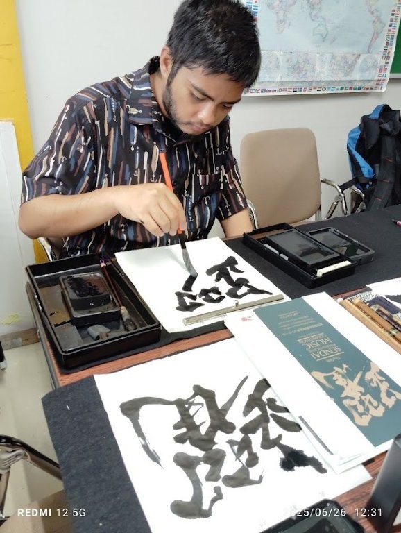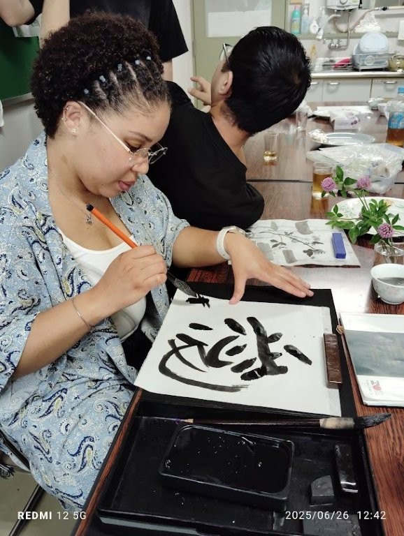 On June 26th, some International students were trying to write some Japanese calligraphy with brush and Japanese black ink (Sumi, 墨). Interestingly, they could made a good stroke despite this is their first time to use the kit for some of them.