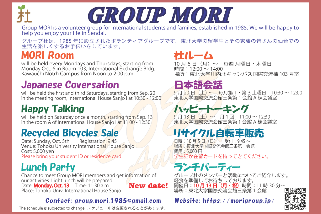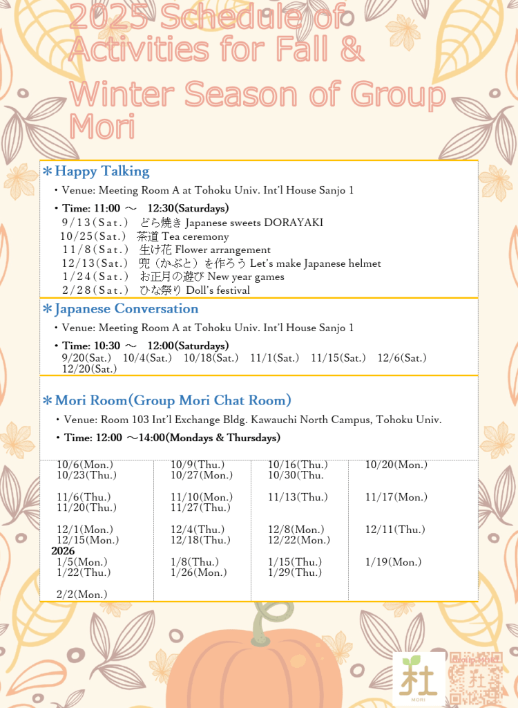 Hello everyone, Group MORI is coming back in this Fall-Winter season 2025 with a bunch of fun and inspiring activities to boost your knowledge about Japanese and Japan. Take notes on these dates and don’t miss them! See you there