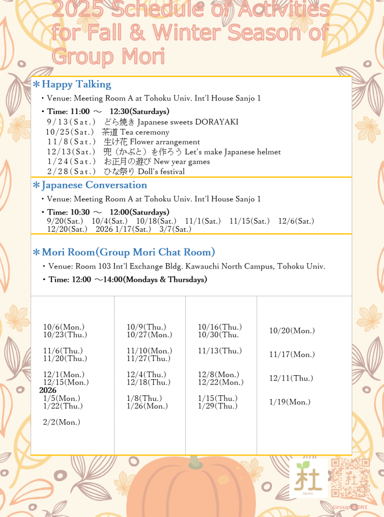 Hello everyone, Group MORI is coming back in this Fall-Winter season 2025 with a bunch of fun and inspiring activities to boost your knowledge about Japanese and Japan. Take notes on these dates and don’t miss them! See you there