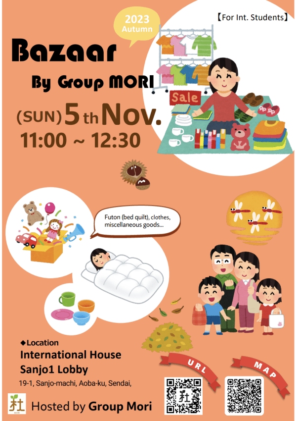 Group MORI will hold a bazaar at Tohoku International House Sanjo 1 Lobby. Come and get your things while they last !